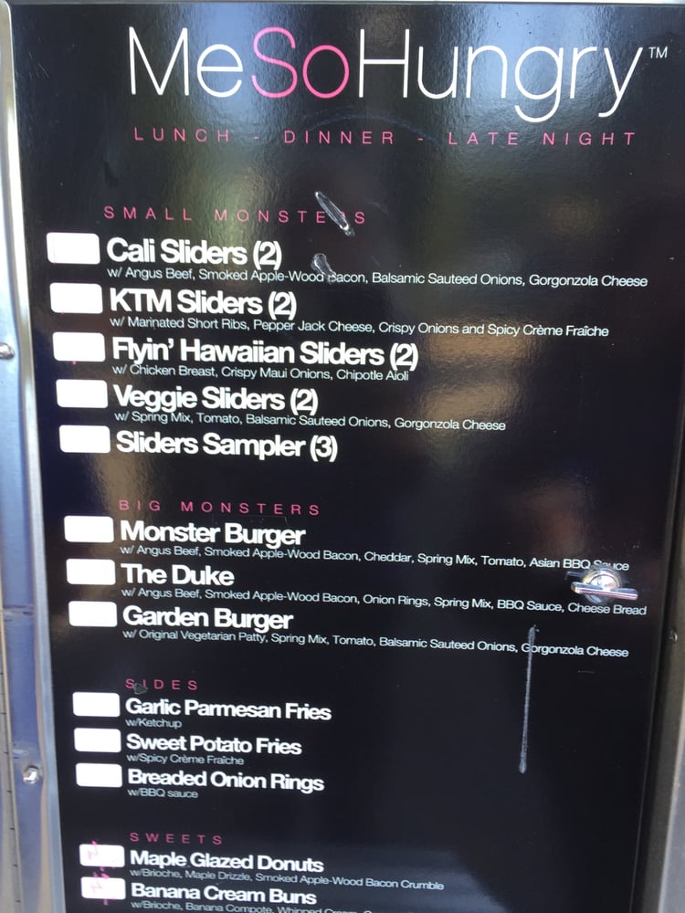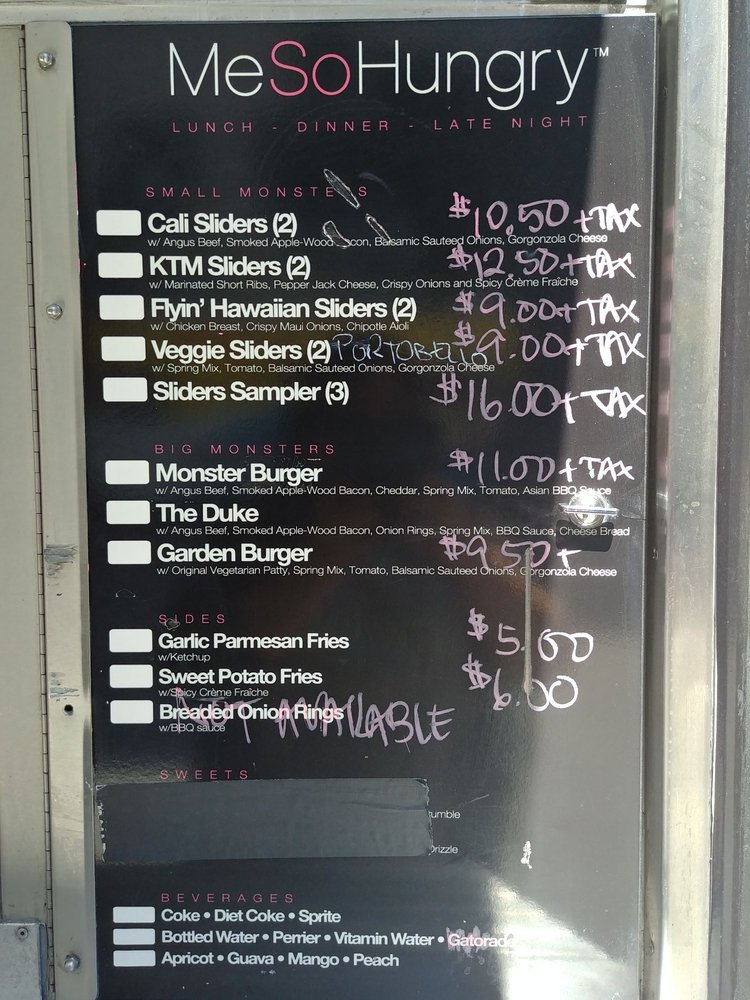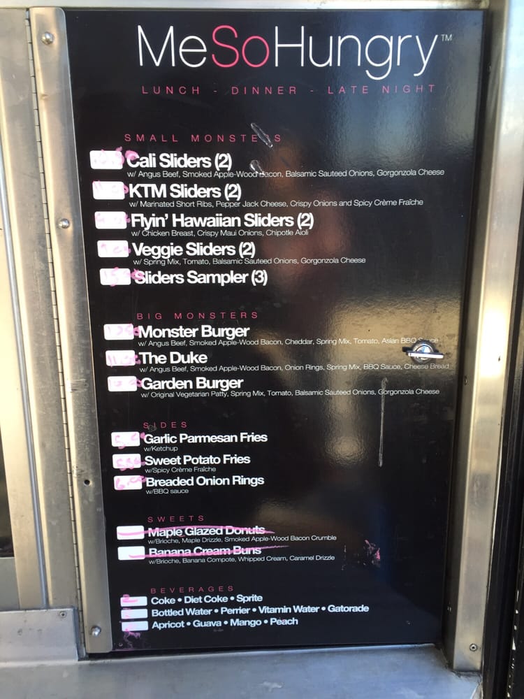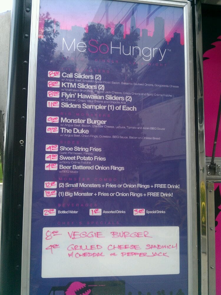 Me So Hungry, located in San Francisco, CA, is a popular food truck known for its delicious burgers and sliders. With options like the portabella burger, monster burger, and The Duke burger, there is something for everyone to enjoy. Customers rave about the quality of the meat, the flavorful toppings, and the perfectly cooked fries. The menu also offers vegetarian options, such as the Cali Slider with angus beef, bacon, onions, and gorgonzola cheese. The casual yet classy atmosphere of Me So Hungry makes it a great spot for groups, kids, and even takeout or delivery. With street parking available and free Wi-Fi, it's a convenient choice for a tasty meal on the go.